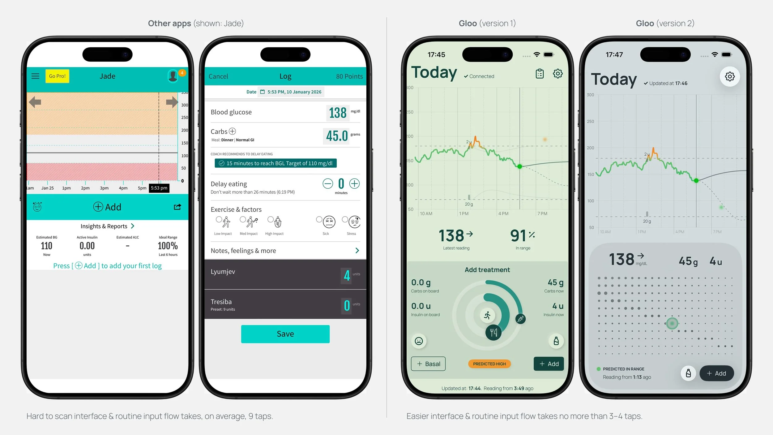 Gloo is a self-initiated product exploring how digital interfaces can support people managing complex, high-frequency decisions. In this case: Type 1 diabetes management using CGMs and insulin injections.
