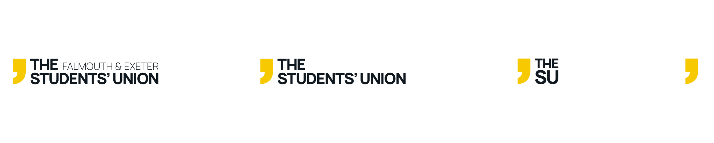 The new logo icon includes an apostrophe, which is a symbol of belonging in the English language. This is to signify that all the students in Cornwall belong to their Students’ Union. Apostrophes can also unite two words, as the SU unites two universities. The colour choice was influenced by Cornwall and its traditional colours (black, gold, and white), with a nod to the beautiful scenery that surrounds the campus in the secondary colour, blue. Four versions of the logo were created, with different size requirement and intended audience. This, combined with the four colour combinations available, makes for a very versatile logo system, with 15 different versions available.
